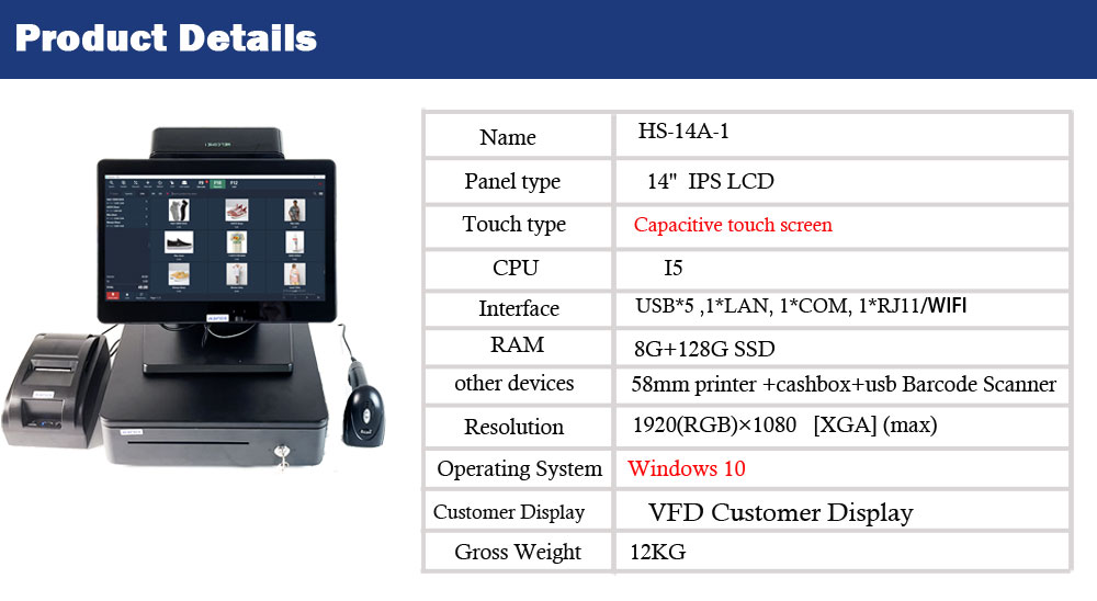 HS-ST54 是 HSPOS 推出的 14 英寸电容触摸一体 POS 机,搭载 i5/8G/128G 高配,内置 58mm 打印机、一维扫描枪、小钱箱与 VFD 客显,送 Windows 收银系统,即插即用,适合超市、餐饮、奶茶店、酒店全场景。